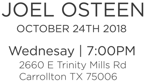Join us for an evening with Pastor Joel Osteen on Wednesday, October 24th at 7pm! Hear an inspiring message from Pastor Joel, and meet him personally when you get your copy of his latest book, Next Level Thinking, signed! We will be streaming this service to all of our campuses! Books will be available for purchase at the Carrollton Campus, before and after service.